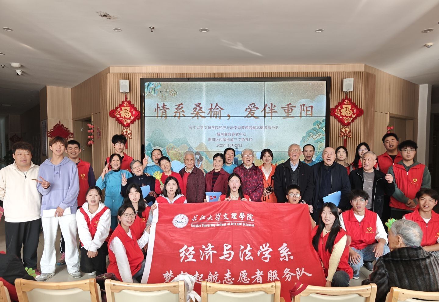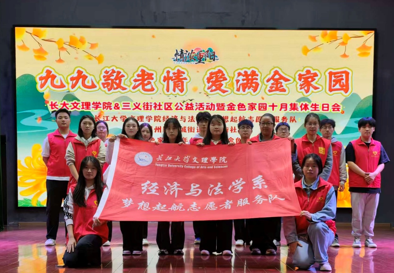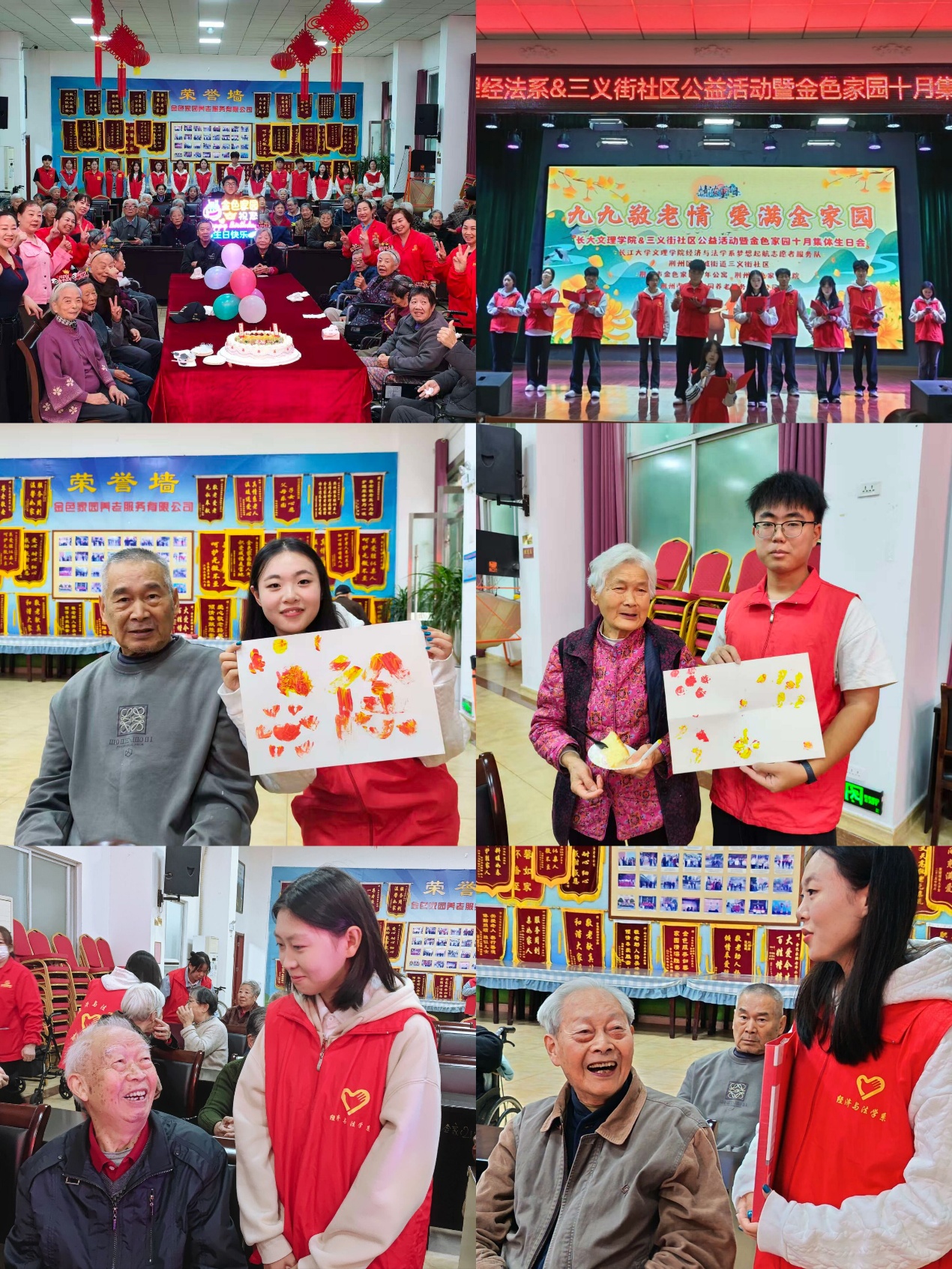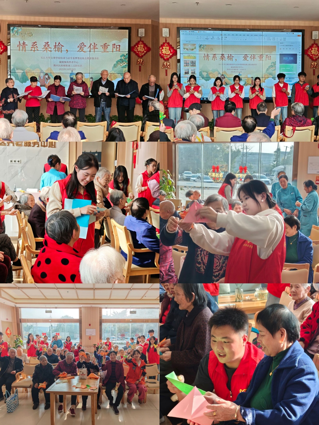 本网讯(见习记者:陈世行 张馨予)岁岁重阳,今又重阳。为弘扬中华民族尊老敬老的传统美德,传承重阳节深厚文化内涵,增强青年员工的人文关怀意识和社会责任感,经济与法学系延续重阳节志愿服务优良传统,于10月组织梦想起航志愿者服务队,先后走进荆州市沙市区金色家园老年公寓、荆州市荆州区城发康养城南御苑社区养老服务中心,开展主题敬老志愿服务活动,为老人们送上满含心意的节日关怀。