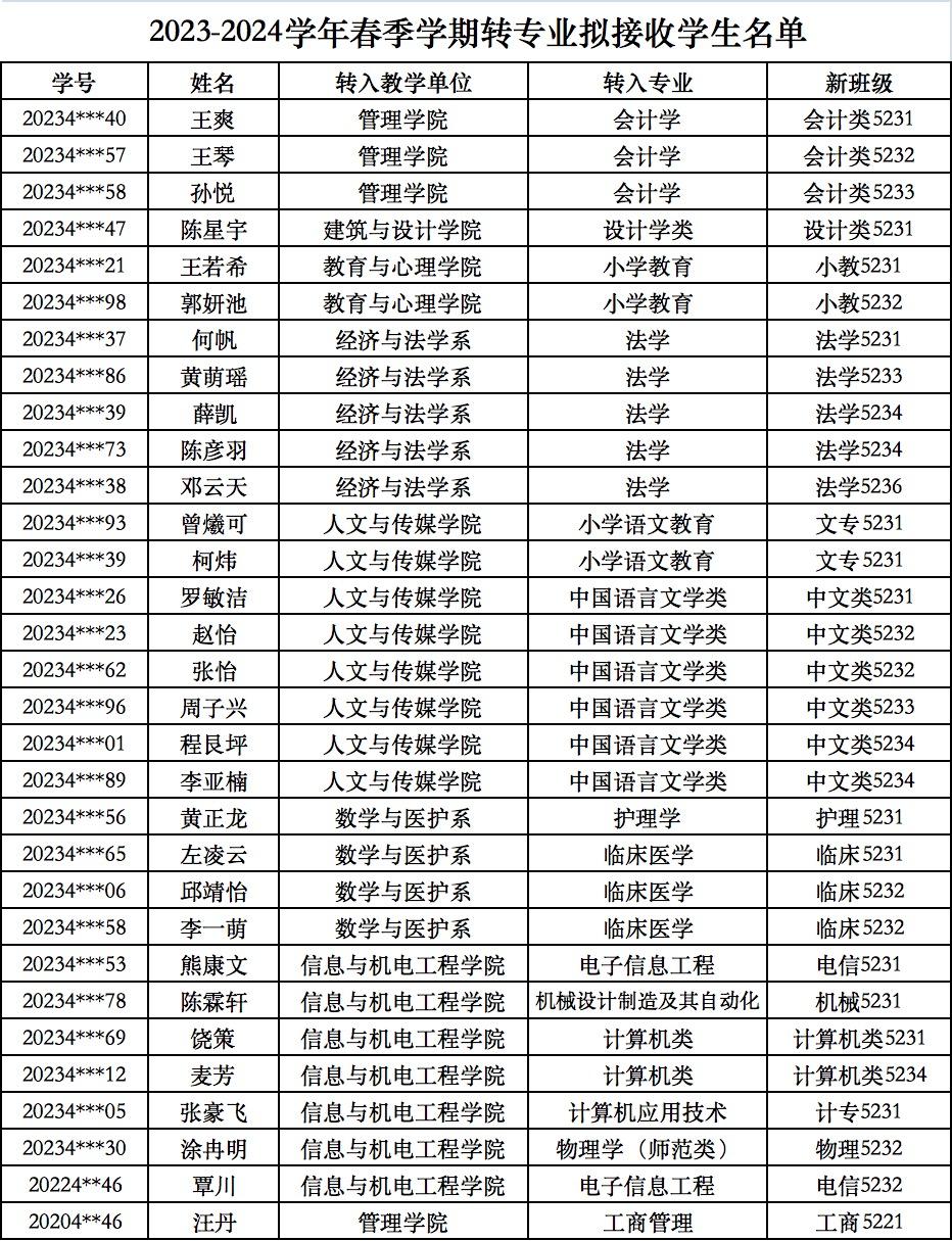 关于2023-2024学年春季学期转专业员工名单的公示
