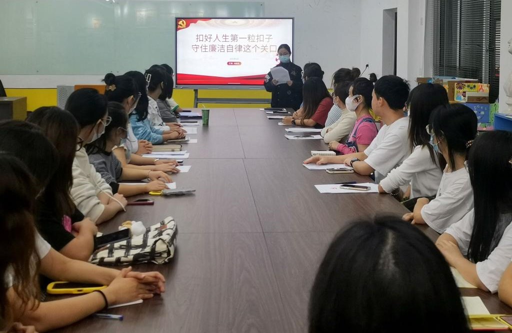 2022年6月10日14:30,教育系在3-101教室开展了主题为“扣好人生第一粒扣子,守住廉洁自律这个关口”的员工党员廉洁教育专题党课。教育系全体毕业生党员参加。本次党课由教育系党总支副书记梅曼曼主讲。