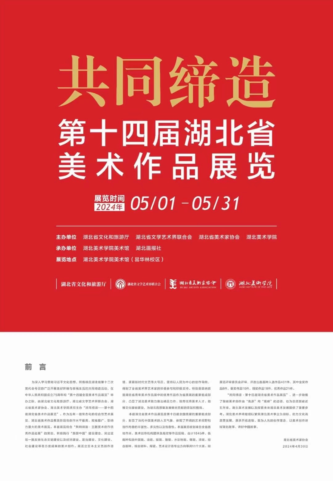 本届美术作品展览由湖北省文化和旅游厅、湖北省文学艺术界联合会、湖北省美术家协会、湖北美术公司共同主办。作为五年一届常态化的综合性艺术展览,湖北省美术作品展是阶段性创作水平最高、规模最广、影响力最大的美术展览。