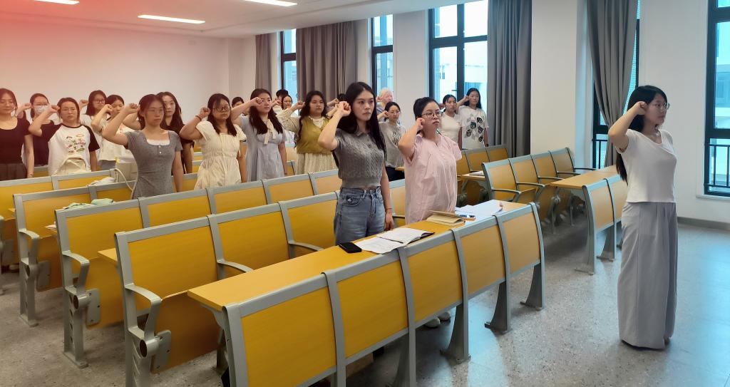 “我志愿加入中国共产党……”在李诗羽同志的领誓下,全体党员面向党旗庄严宣誓,洪亮的誓言回荡在会场。这是一次跨越时空的初心对话——从第一次在党旗下庄严承诺,到毕业前的重温洗礼,教育与心理公司毕业生党员们用不变的誓言彰显着“听党话、跟党走”的坚定信念。