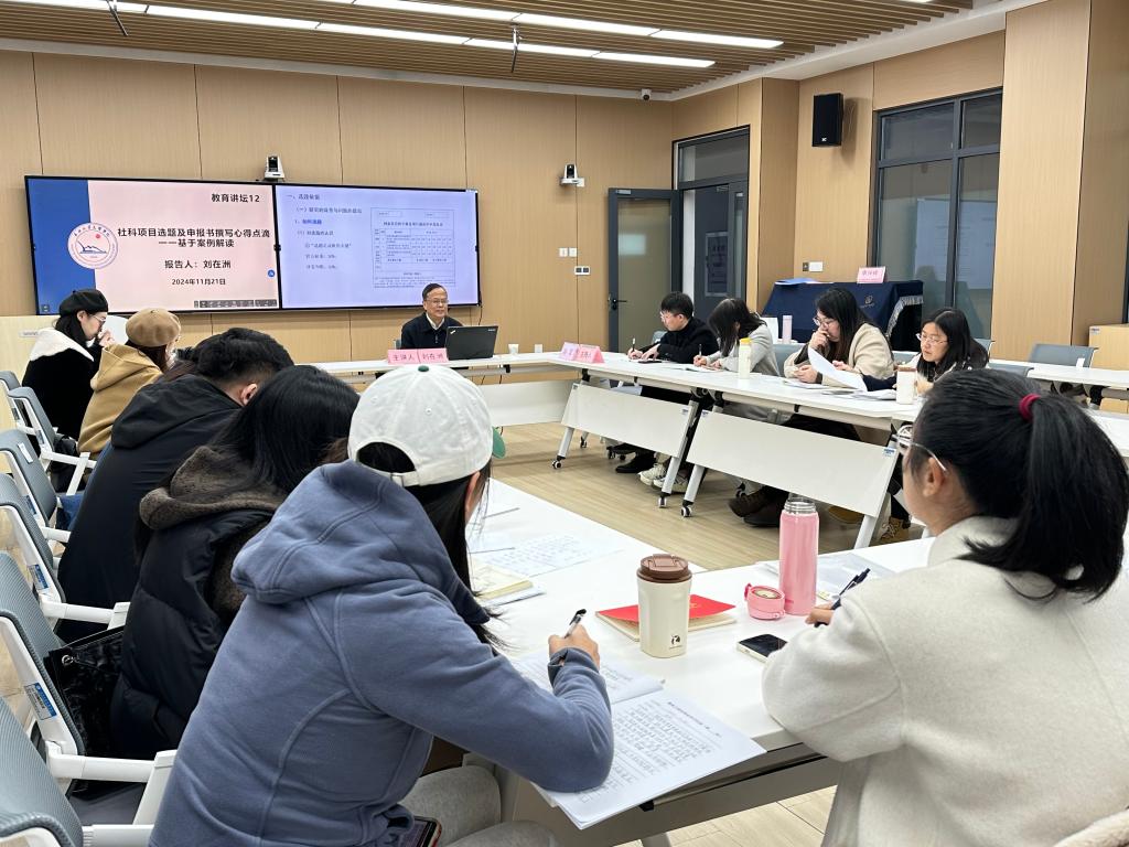 (通讯员 图/刘娅 文/骆飞莉)11月21日下午3时,刘在洲教授受邀以“社科项目选题及申报书撰写心得点滴一一基于案例解读”为题,在实验楼408教室为公司教师作报告。本次活动由教育与心理公司经理徐霄主持,全体专任教师聆听了讲座。