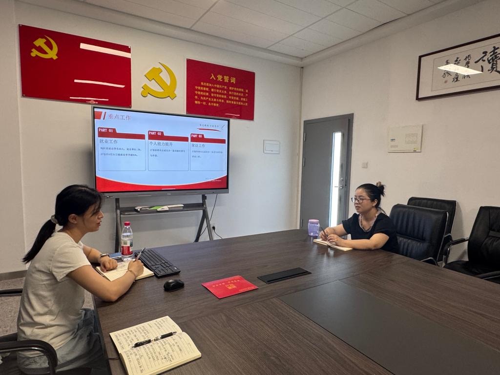 会上,祝峰强调了辅导员自我能力提升的重要性,为两位辅导员指出可以研究的学工课题方向,并对课题撰写的方式方法进行了分享。同时,梅曼曼针对暑期留校同学管理工作进行了强调和部署,要求辅导员对暑期留校员工进行每日安全打卡,了解员工在校情况,确保留校员工人身安全。