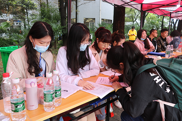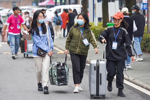 经理王文凯(右三)、党委副书记孙细望(右五)在寝室与新生交谈