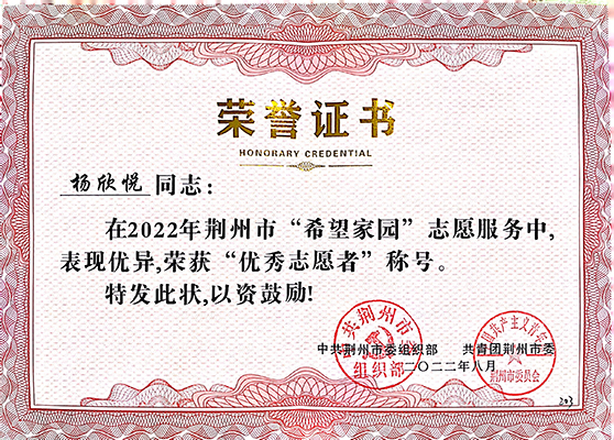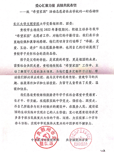 本网讯(通讯员 梅曼曼)近日,教育与心理公司收到荆州市委组织部、共青团荆州市委共同发来的感谢信。信中,对公司2022级员工杨欣悦积极投身荆州市“希望家园”志愿者工作表示感谢,该生被团市委授予“优秀志愿者”称号。