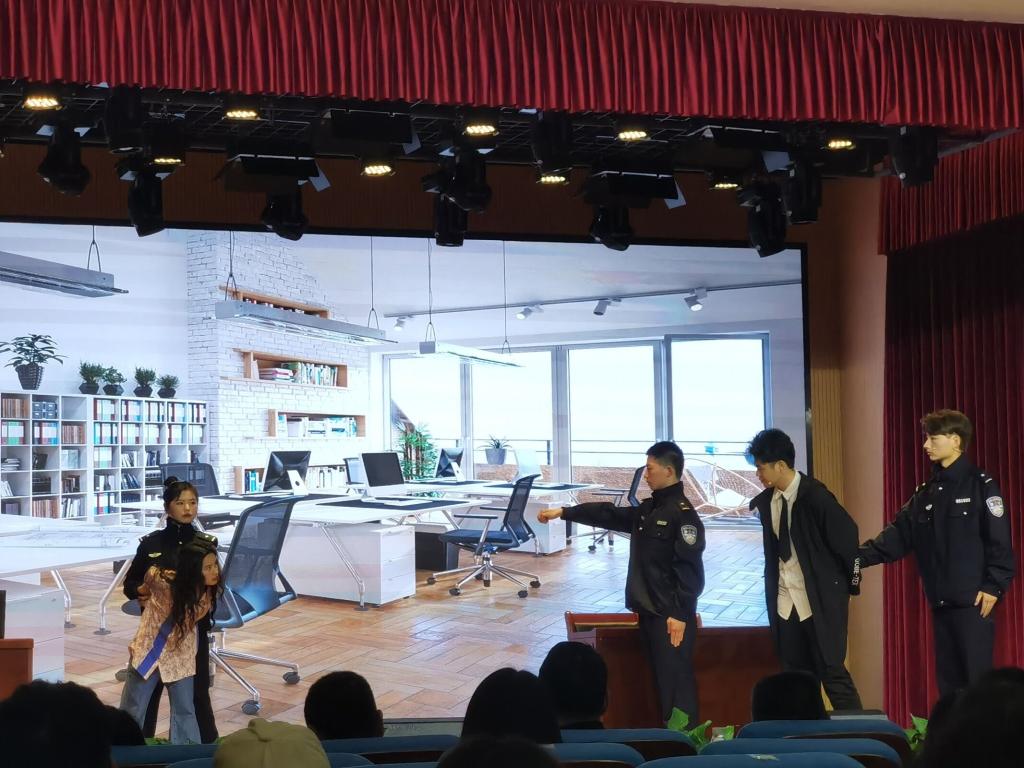 在情景剧表演中,节目紧扣主题,通过诙谐、生动的表演把“杀猪盘”“网络游戏诈骗”这些具有代表性的网络诈骗方式直观的呈现在同学们面前;节目内容别出心裁和表演妙趣横生,让同学们在欢声笑语中获得防诈骗技巧,提升防诈能力。