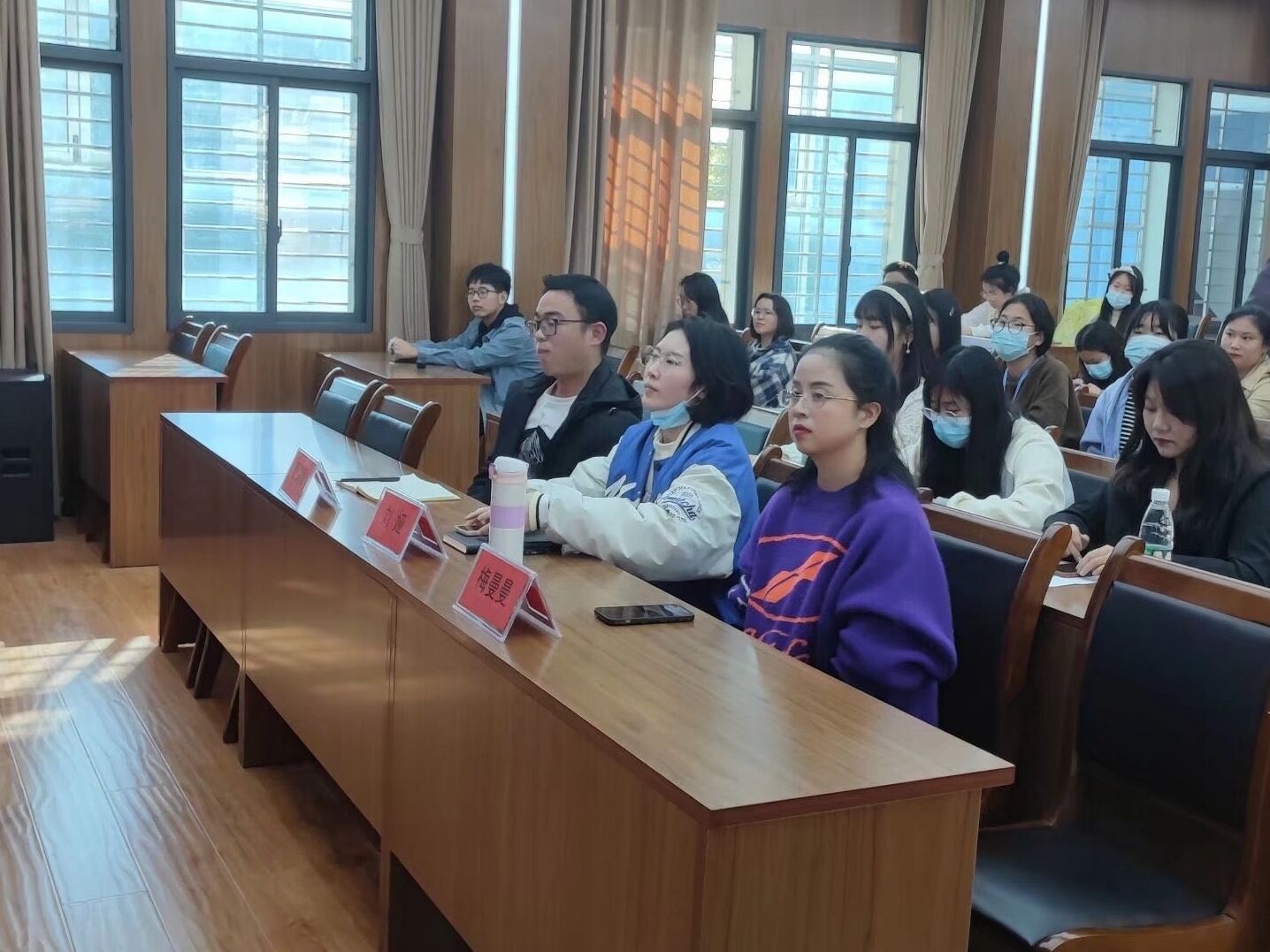 本网讯(员工通讯员 王琪)11月18日下午,我系分别在三教202和408会场开展以“青春与祖国同行”为主题的思想政治理论课校内社会实践活动。参加此次活动的有党总支副书记梅曼曼、辅导员杨琪老师、覃儒卿老师、李晓怡老师、刘娅老师及系部全体大一员工。