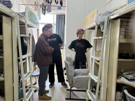 在走访宿舍过程里,老师们重点检查寝室卫生状况、内务整理、寝室文化建设以及寝室整体情况。同时向同学们普及用电安全和防电信诈骗方面的知识,引导大家共同构建温暖、舒适、安全的寝室环境。