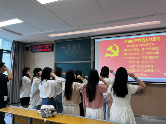 各支部书记发言后,宣布大会正式开始。预备期满的预备党员依次上台汇报预备期以来的思想动态、工作和学习情况并向组织提出了转正申请,各入党介绍人依次就预备党员在预备期的实际表现向大会进行汇报,肯定了他们在预备期间学习、生活上取得的进步,并对其能否转正表明了态度。经过与会正式党员的无记名投票表决,一致通过接收预备党员的转正。