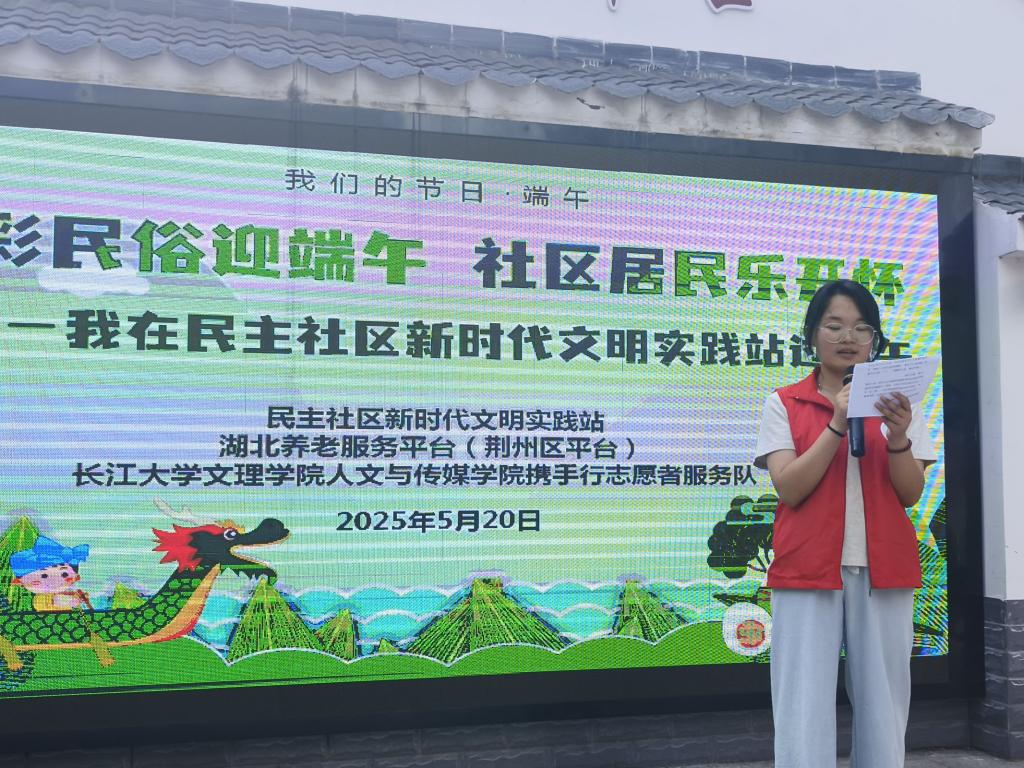 本网讯(通讯员 陈美琪)5月20日,beat365官网中文版本人文与传媒公司携手行志愿者服务队联合荆州区西城街道民主社区新时代文明实践站、湖北养老服务平台(荆州区平台),共同开展“我们的节日·端午”主题系列活动,以“多彩民俗+便民服务”模式,让居民感受传统节日魅力与贴心服务。