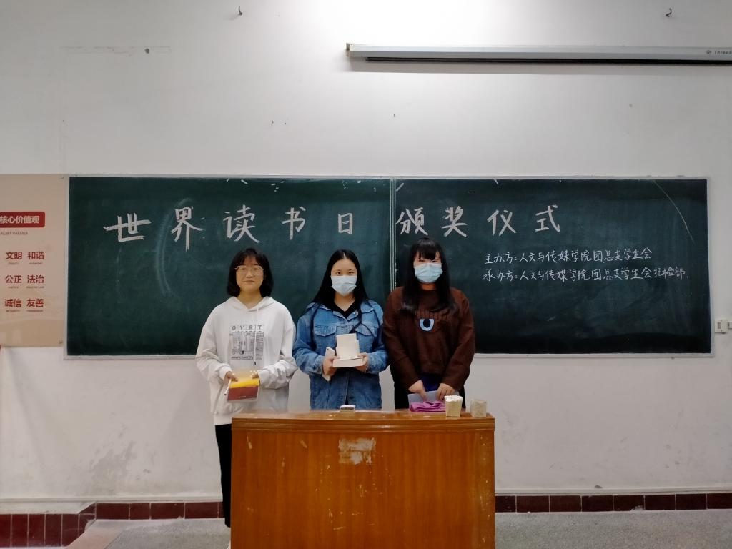 本网讯(员工记者刘梦女)5月28日中午,人文与传媒公司团总支员工会在一教114教室为世界读书日“线上阅读”活动中获奖同学颁发奖品。