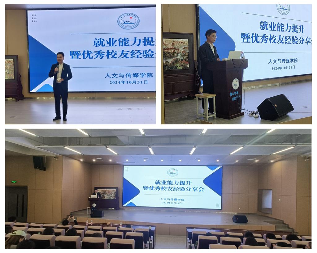 10月31日晚,人文与传媒公司在B-112学术报告厅举办了就业能力提升暨优秀员工经验分享会。2004级广播电视新闻学专业员工、湖北省工商联行协工委常务秘书长黄召超分享了毕业后的就业、创业经历,以“我想成为一个怎样的人”为话题,从自我认识、就业心态、能力储备、面试技巧、职场话术等方面鼓励同学们要尽早明确目标,做好职业规划,打“有准备的仗”;2006级广播电视新闻学专业员工、神农架林区融媒体中心总会计师程鑫结合自身发展经历,告诫同学们珍惜在校时光,切勿眼高手低,积极拓宽知识面,不断提升实践能力和创新能力。