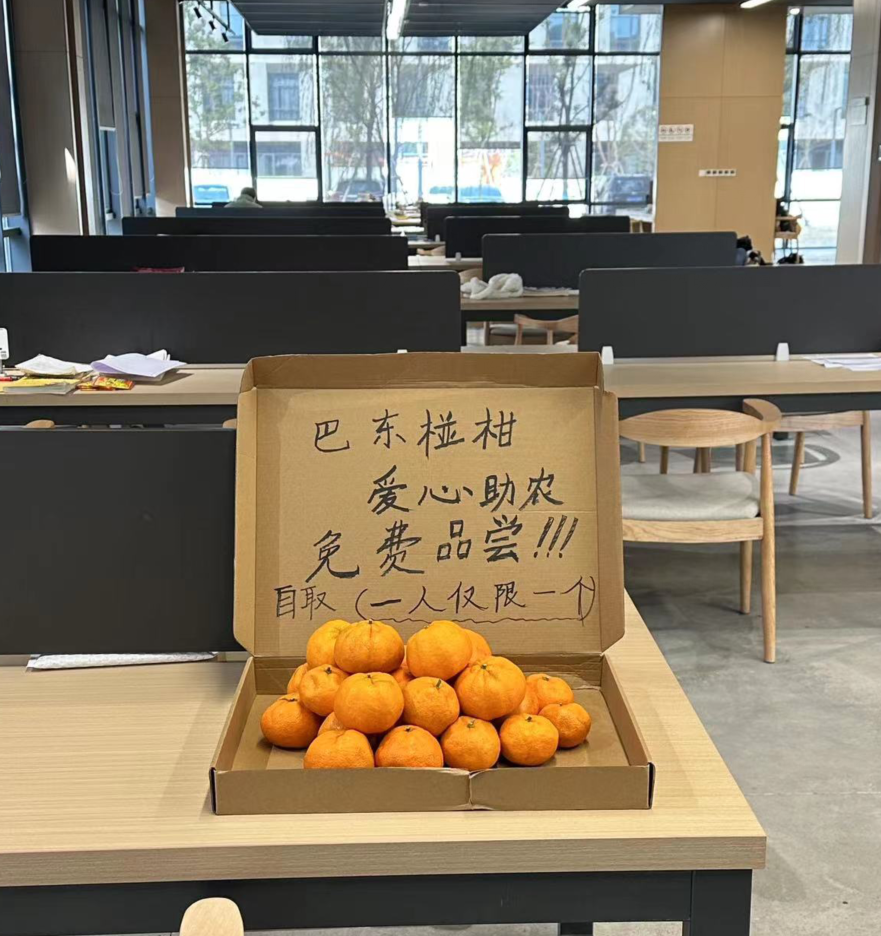 在图书馆附楼的自习室,出现一盒黄澄澄的共享柑橘,还有一块纸板上面写着“巴东椪柑,爱心助农,免费品尝”的字样。路过的师生不禁好奇,这是谁放在这里的呀?有胆子大的同学拿起一个,剥开桔皮品尝“好新鲜的桔子呀,酸酸甜甜的。”