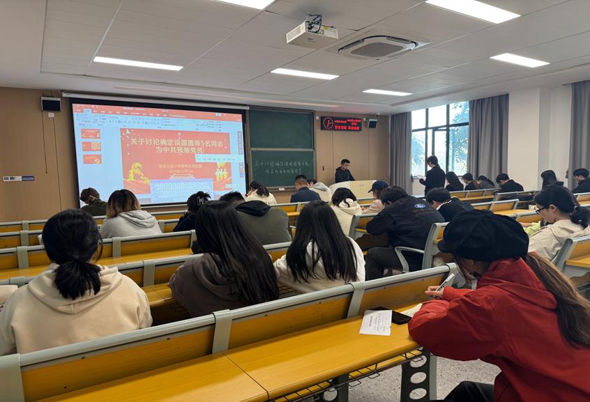 接下来,组织委员报告对谈圆圆、郑晓蓉、张心如、付婉晴、孙浩文5名同志的审查情况,对其能否转为预备党员发表意见。每位发展对象的政治审查、培养教育和考察情况,确保审查工作全面细致、不留死角。与会党员本着对党组织高度负责的态度,对5位发展对象能否入党进行了充分讨论。大家踊跃发言,既肯定成绩和优点,又坦诚指出不足和努力方向,提出了许多中肯的意见和建议。经支部大会无记名投票表决,大会同意接收谈圆圆、郑晓蓉、张心如、付婉晴、孙浩文等5名同志为预备党员。谈圆圆等五名同志当场表态,感谢组织培养与同志帮助,承诺将以更高标准要求自己,在后续学习工作中锤炼党性、践行初心。