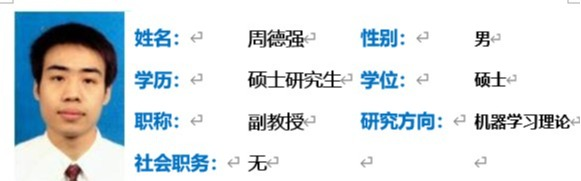 周德强,男,1974年生,中共党员,湖北襄阳人,副教授,2001年毕业于湖北大学,获应用数学硕士学位。主要研究方向为机器学习、统计学习理论。公开发表科研论文 30余篇 ,其中被EI收录3篇、 CSSCI收录6篇,ISTP收录1篇,主编教材1部。参与国家自然科学基金1项, 参与完成湖北省自然科学基金1项。近五年发表学术论文2篇,被CSSCI收录1篇。
