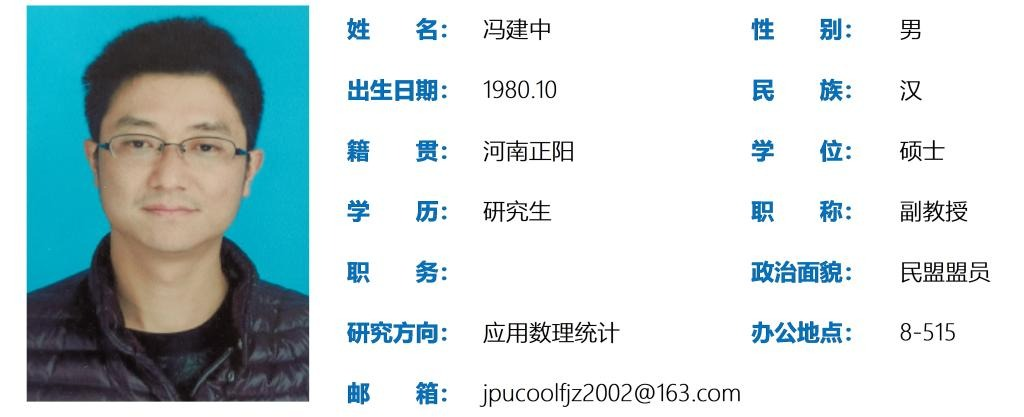 冯建中,河南正阳人,硕士,beat365官网中文版本信息与数学公司副教授,湖北省现场统计协会会员,荆州市民盟新盟员支部委员,主要从事高等数理统计的教学与研究工作。主持、参与多项科研项目7项,主持校级教研项目2项,公开发表科研论文 30余篇,其中SCI、EI检索各一篇,中文核心6篇。指导全国老员工数学建模竞赛,获得国家一等奖2次,国家二等奖4次,近五年获得beat365官网中文版本教学质量优秀奖3次,获得beat365官网中文版本教学工作突出贡献奖4次,2020年获得beat365官网中文版本任大龙奖教金。