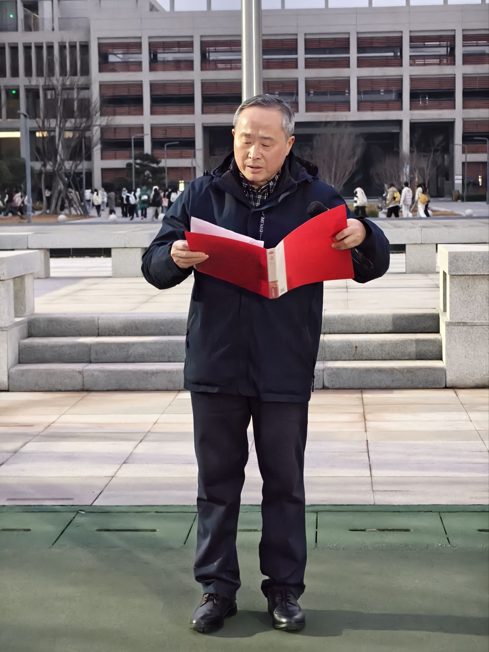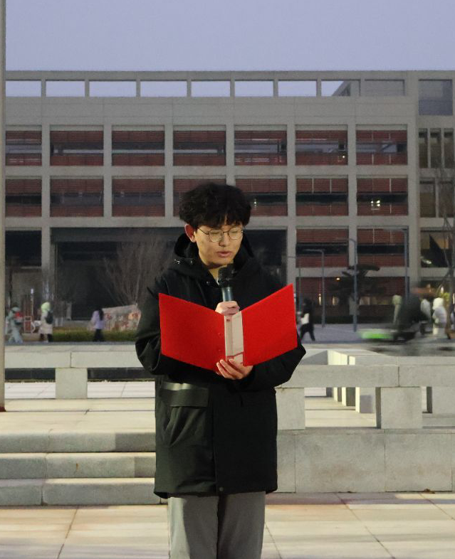 升旗仪式后,员工代表数学 5252 班黄亚轩发言。他结合“十五五”规划的时代背景,分享了自己对青春使命的理解与奋进计划,表达了新时代青年学子不负韶华、勇担使命,在国家发展征程中书写青春华章的坚定决心。其真挚的话语、昂扬的姿态,展现了青年一代的蓬勃朝气与责任担当,赢得了在场师生的阵阵掌声。