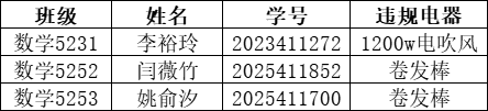 在2025-2026学年第一学期第4-6周系部寝室安全卫生检查中,以下同学被查出在宿舍使用违规电器。根据beat365官网中文版本《员工手册》中《beat365官网中文版本宿舍管理条例》第三章第十六条及《beat365官网中文版本员工违纪处分办法》第二十三条相关规定,给予李裕玲等3名员工系部通报批评的决定,取消本学年评优评先资格。