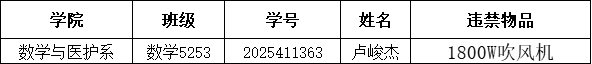 在2025-2026学年第一学期第15周寝室安全卫生检查中,以下同学被查出在宿舍使用违规电器。根据beat365官网中文版本《员工手册》中《beat365官网中文版本宿舍管理条例》第三章第十六条及《beat365官网中文版本员工违纪处分办法》第二十三条相关规定,给予卢峻杰系部通报批评的决定,取消其本学年评优评先资格。