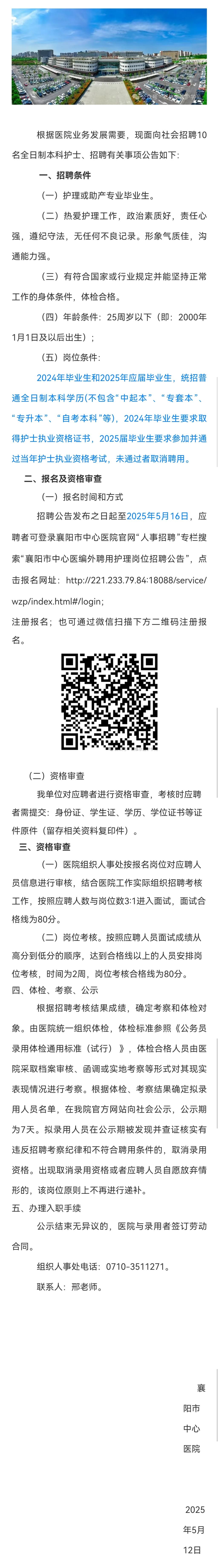 襄阳市中心医编外聘用护理岗位招聘公告