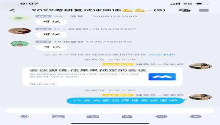 动员冲刺大会上,10名同学分别就英语、专业课成绩进行了简单介绍,并简要谈了谈当前复试准备工作。随后,黄瑾老师和李佳老师就她们当年考研复试经验同同学们作详细交流,强调了考研复试准备的重要性。希望同学们端正心态,努力复习,积极应战。最后,两位老师对同学们提出的问题进行一一解答,线上气氛十分热烈。