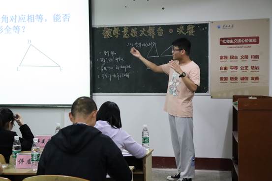 本次决赛共有十位选手参与,参赛选手通过抽签确定参赛内容,根据内容提前准备教案、PPT。比赛方式为授课讲解,在规定时间内,选手通过多媒体和板书对数学知识、习题进行传授、讲解。各位选手准备充分、灵活运用知识,沉着冷静、自信满满地展示自我风采。比赛结束后,史千里老师对本次比赛做出点评,他首先用三个例子来说明了数学的好处,然后对本次参赛选手的能力做出肯定,最后指出了选手们在普通话、板书、PPT制作、讲题方式等方面的不足,他希望选手们根据观众的反应,及时对自己的授课方式进行调整,达到传授知识的目的。