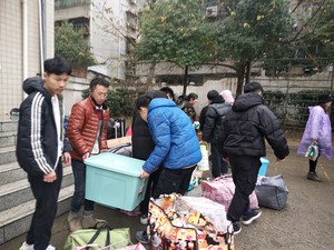 本次搬迁遇到的最大困难是天气。早上九点多,东区南苑大门口,最后一拨员工行礼尚未完全装上车,调皮的小雨就开始淅淅沥沥来捣乱。上午九点四十左右,12辆车陆续到达沙市校区基础医公司,雨雪也更加任性和放肆,一会哗啦啦一阵,一阵淅沥沥一拨,一会突然雪停雨住。为了加快搬运进度,沙市校区相关领导从药房实验室等各部门给同学们借来了推车,系部李书记康书记和沙市校区罗主任直接加入到热火朝天的搬运队伍中。直到12点所有员工行礼都搬进宿舍,雨雪依然胡闹的叫嚣。几乎所有师生被汗水和雨水反复洗礼。