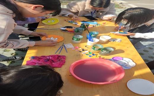 活动举办期间,同学们都非常积极的到12舍篮球场报名参加活动。同学们领取到绘画的盘子后,在一旁提供有颜料、画笔的桌子上开始涂画,以画来表达他们内心深处的情感。活动还通过抽奖环节发放面具和陶瓷娃娃,抽中的同学将给面具和陶瓷娃娃上色。活动有两轮评选,第一轮以绘画的精美程度进行网上投票和评委评分;第二轮以作品精美程度和现场说明由评委进行现场评分,评分之后进行排名。