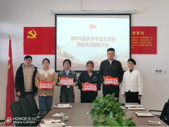 会议最后,支部书记李娜同志和组织委员聂志同志向新接收党员同志授“党员寝室”牌。随后支部书记李娜同志对此次会议进行总结,她指出:希望各位预备党员同志继续努力,提高自身政治素养,不忘初心,牢记使命。此次预备党员接收大会,考察了入党申请人的入党态度和动机,为全面建设一个更好的党支部提供了良好条件,为数学与医护系员工党支部注入了新的先锋力量。
