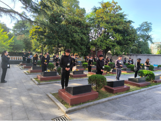 活动依照流程有序进行。第一项:在革命烈士碑前怀着庄重肃穆的心情奏唱国歌;第二项:先由党员代表董俊豪带领中共党员宣誓,后由团员代表李古月带领共青团员宣誓,向先烈表明坚定为人民服务的信念;第三项:全体肃立,默哀三分钟;第四项:由员工代表吴飞帆同学发言,宣扬烈士的英勇事迹与精神,鼓励我们向先烈学习,传承红色基因;第五项:我们走到烈士的墓碑前三鞠躬,献上鲜花;最后同学们有序参观烈士公墓亭和墓区以及烈士事迹展览馆。
