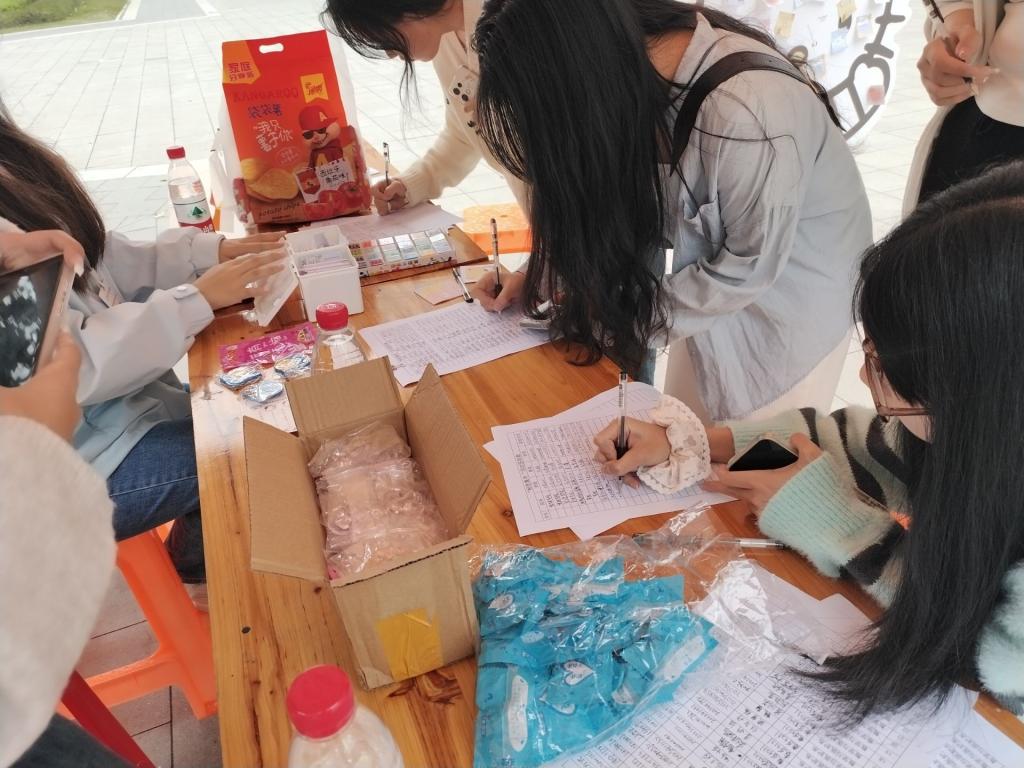 情绪分享铺里,参与者依当下情绪自由剪裁、拼贴图案文字,组合成视觉化 “情绪画像”。能量满满店中,参加活动的同学们在棚子下的纸箱子中选取能量小贴纸,同学们到情绪板上粘贴能量小贴纸,并且可以选择自己喜欢的颜色的印泥,留下专属手印拍照留念。
