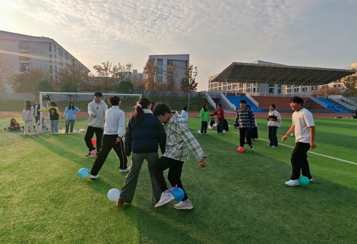 随后进 行的“ 背对背传气球 ”游戏更是考验团队协作能力,两两一组的同学们背靠背夹住气球,小心翼翼地向 终点移动,过程中状况百出,却也让大家更加深刻地体会到团队协作与沟通的重要性。