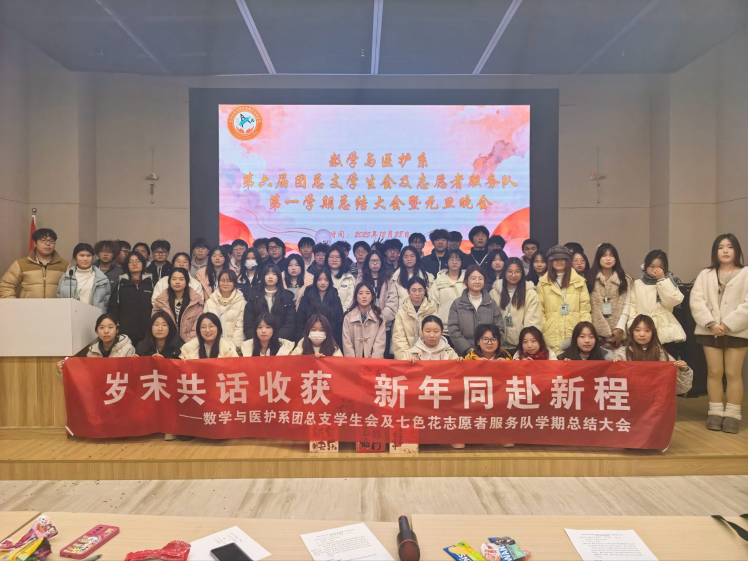 冬韵渐浓,学期收官。数学与医护系于12月28日晚7点在图书馆103会议室召开第六届团总支员工会及七色花志愿服务队2025-2026学年第一学期期末总结大会暨元旦晚会。数学与医护系党总支副书记燕梦蝶出席,员工会全体成员齐聚一堂,复盘过往工作,描绘发展蓝图,共迎元旦新禧。