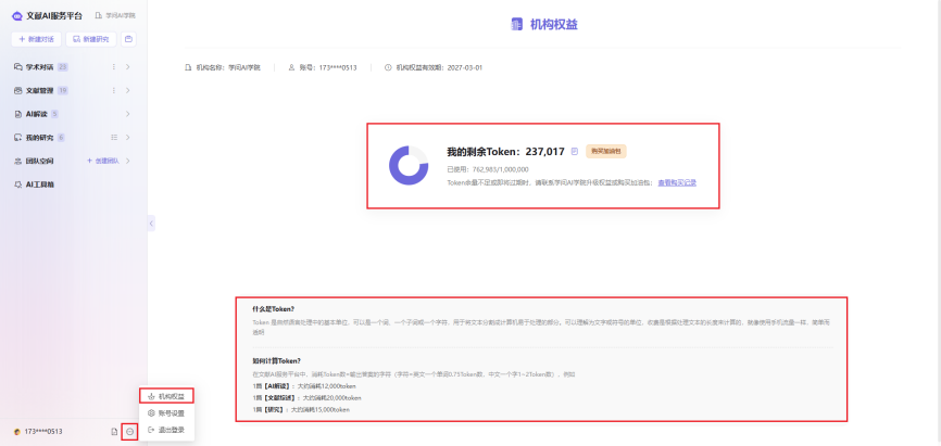 可通过左下角的机构权益查看剩余token