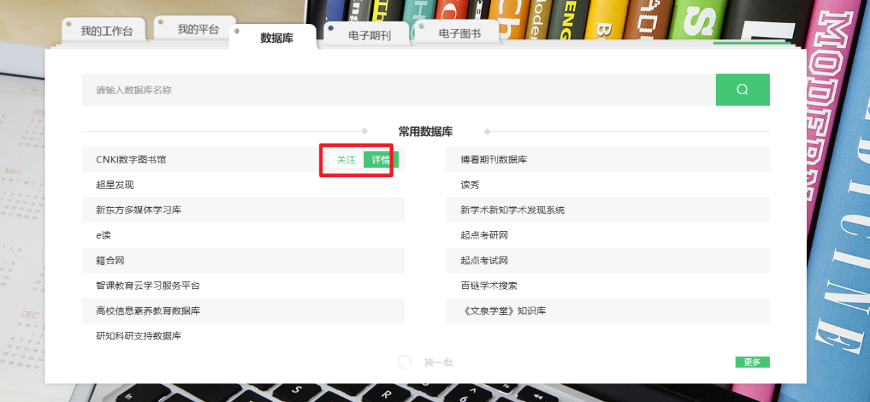 读者可对数据库进行关注,系统会将关注的数据库推送到首页。以后使用,就无需再进行检索。关注了的数据库,可在“个人中心”进行查看。