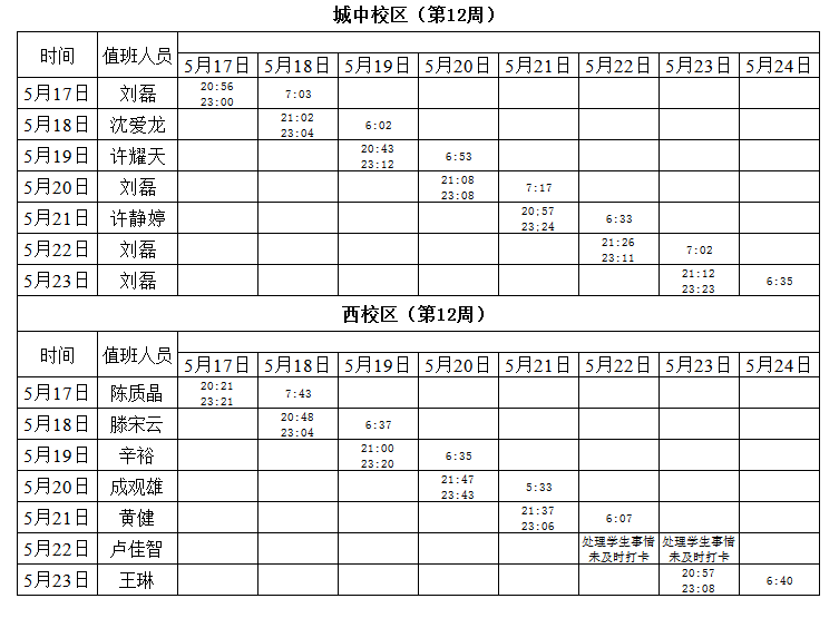 2020-2021学年第二学期第12周学工人员寝室值班通报