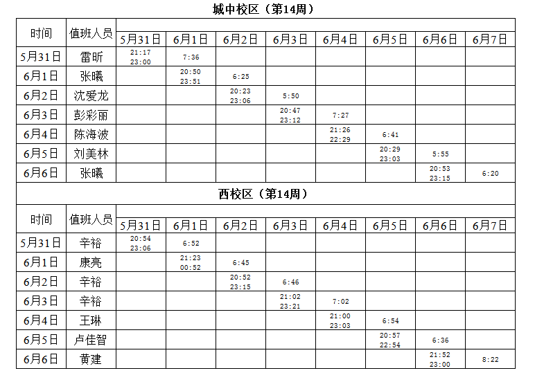 2020-2021学年第二学期第14周学工人员寝室值班通报