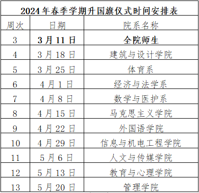 4.请各教学单位按照时间安排,结合当前时代背景,认真策划,精心组织,加强宣传教育,并于升旗前一周周四将活动方案发送员工工作部郭松明老师。