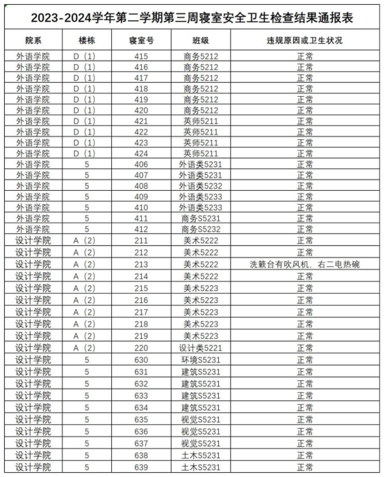 2023-2024学年第二学期第三周寝室安全卫生检查结果通报