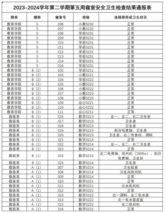 2023-2024学年第二学期第五周寝室安全卫生检查结果通报