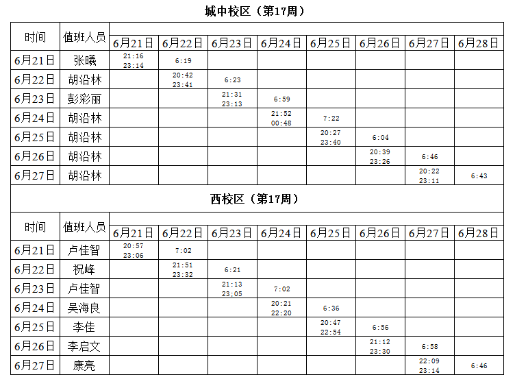 2020-2021学年第二学期第16-17周学工人员寝室值班通报