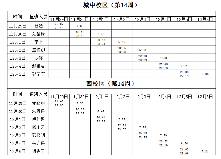 2021-2022学年第1学期第14周学工人员寝室值班通报