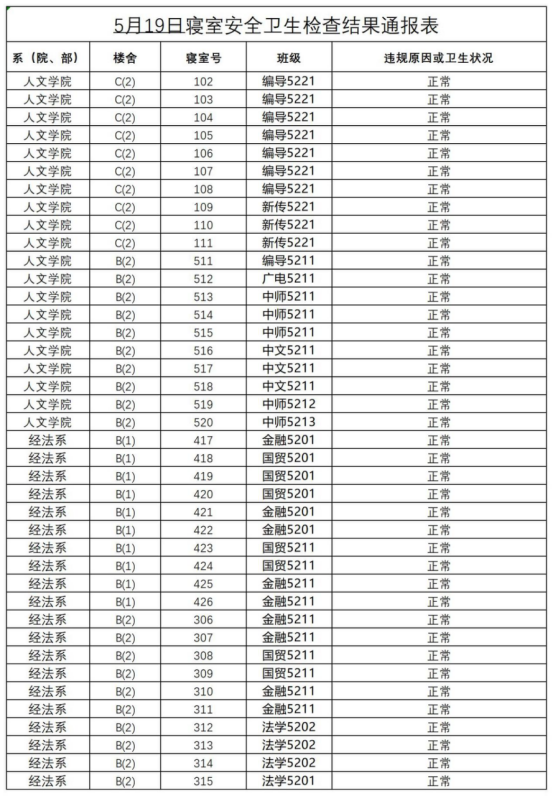 2022-2023学年第二学期第十四周寝室安全卫生检查结果通报