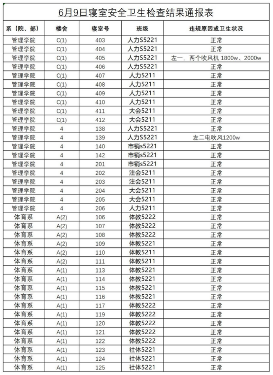 2022-2023学年第二学期第十七周寝室安全卫生检查结果通报