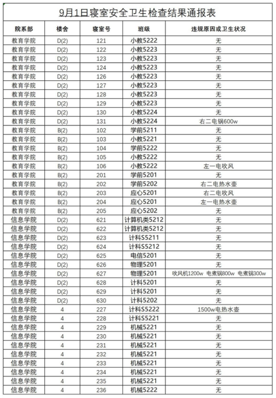 2023-2024学年第一学期第一周寝室安全卫生检查结果通报