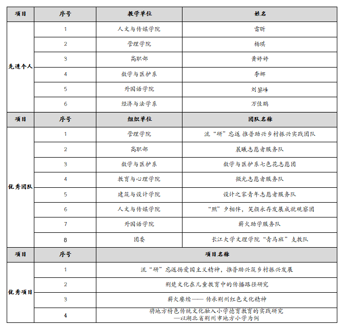 根据《关于开展2023年湖北省大中专员工志愿者暑期文化科技卫生“三下乡”社会实践活动总结和通报工作的通知》要求,经自主申报、各教学单位推荐、团委评审,报领导审批,现将2023年湖北省大中专员工志愿者暑期文化科技卫生“三下乡”社会实践优秀团队、优秀个人和优秀项目的拟推报名单公示如下(公示排名不分先后):