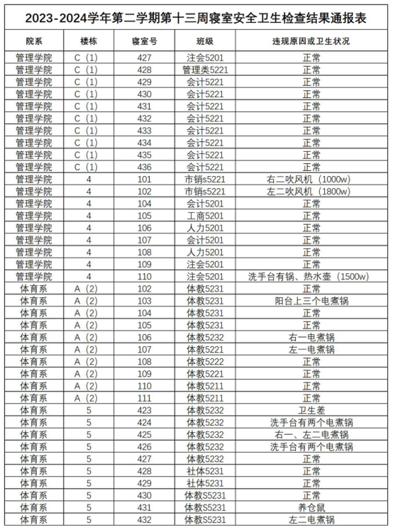2023-2024学年第二学期第十三周寝室安全卫生检查结果通报