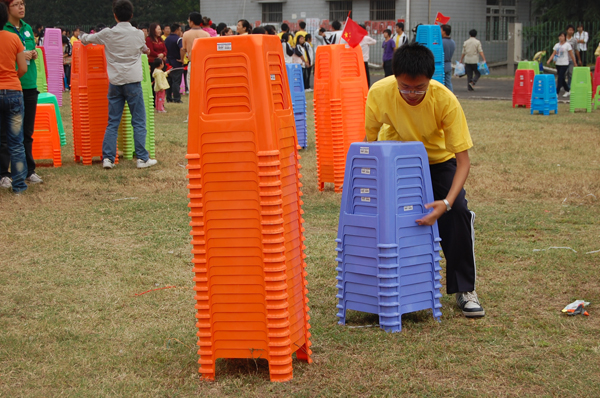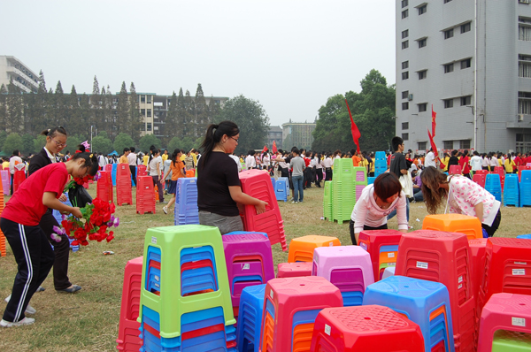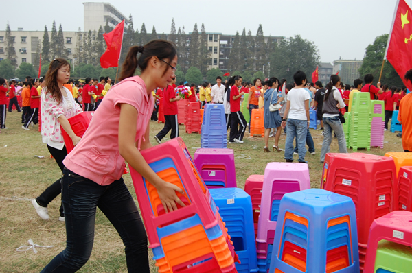 26日早上八点,院团委员工会的所有员工干部便来到体育场为下午两点的红歌会做准备。十五位工作人员,将4500张板凳,遵循着“每张板凳间隔0.5米,每个学部间隔1.5米”的原则,一丝不苟的摆放。经过近两个小时的工作,看着五彩的板凳整齐的摆放在场地上,如彩虹般绚烂,他们脸上戴着满意的笑容,来自体育部的一位08级的同学告诉记者:“员工干部的宗旨就是服务他人,锻炼自我,这是我们分内的事情,是我们应该做的,也是我们应该做好的。”