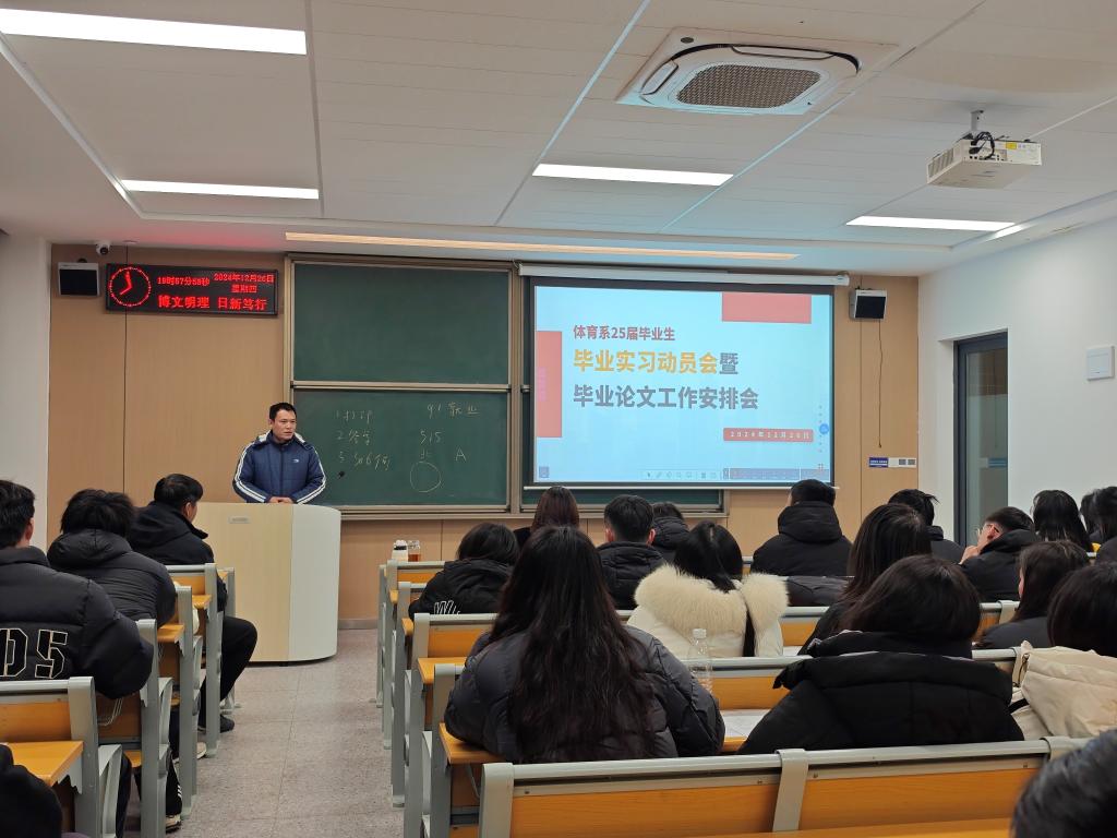 为确保2025届毕业生毕业实习和论文工作顺利,beat365官网中文版本体育系于2024年12月26日举行了相关动员和安排会议。会议由黄贝老师主持,体育系领导、辅导员、班主任、指导教师及全体2025届毕业生参加。