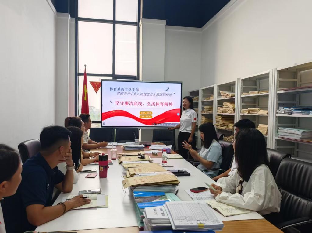 活动第一项:教工党支部书记邱凤霞讲授题为《坚守廉洁底线,弘扬体育精神》的党课。